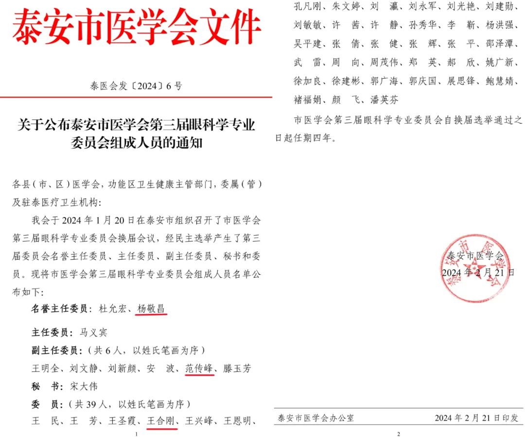 ? ? ?2月21日,泰安市醫學(xué)會(huì )正式發(fā)文《關(guān)于公布泰安市醫學(xué)會(huì )第三屆眼科學(xué)專(zhuān)業(yè)委員會(huì )組成人員的通知》。我院CEO楊敬昌擔任名譽(yù)主任委員、院長(cháng)范傳峰當選副主任委員、副院長(cháng)王合剛成為委員之一。